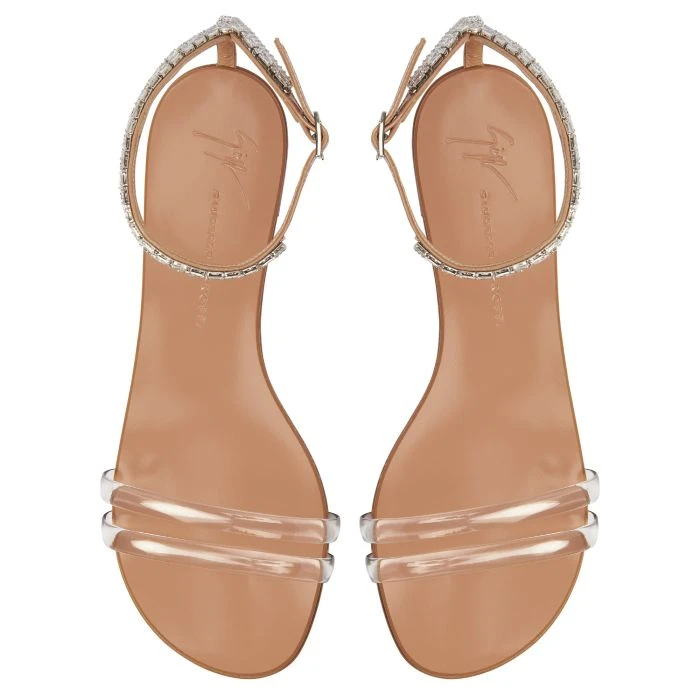 Flat sandals crafted from flesh-coloured synthetic patent-effect fabric with matching leather sole, featuring a clear PVC double front band and a silver metal jewel accessory with crystals that embellishes the whole ankle strap.