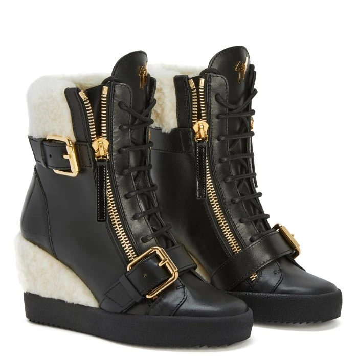 These high-top wedge sneakers are crafted from black leather and white eco-fur with black cotton laces, and feature a side zipper closure and golden metal straps with buckle; the black rubber sole with hidden wedge covered in eco-fur completes this sporty-chic model.