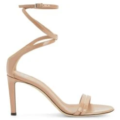 These sandals are crafted from flesh-coloured, patent-effect fabric and feature a leather sole, and are characterised by a matching covered heel, a double front strap and a thin, crossed ankle strap with a small silver metal buckle to adjust the fastening.