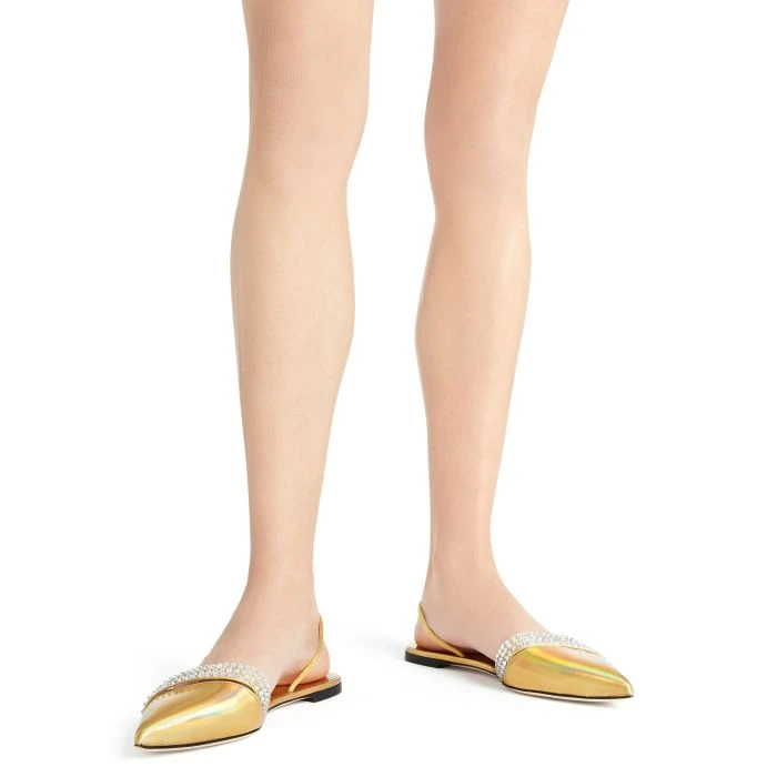 These pointed-toe slingback flat sandals, crafted from golden laminated synthetic fabric and synthetic satin, feature a toe box with a clear PVC insert and a thin strap on the instep and are embellished with embroidered rows of crystal-coloured rhinestones.