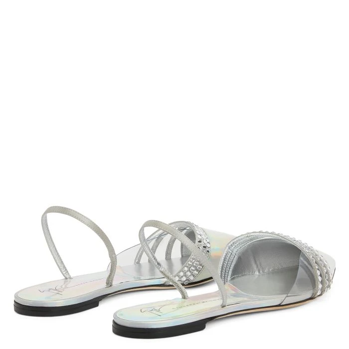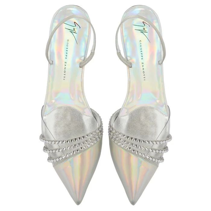 These pointed-toe slingback flat sandals, crafted from silver laminated synthetic fabric and synthetic satin, feature a toe box with a clear PVC insert and a thin strap on the instep and are embellished with embroidered rows of crystal-coloured rhinestones.