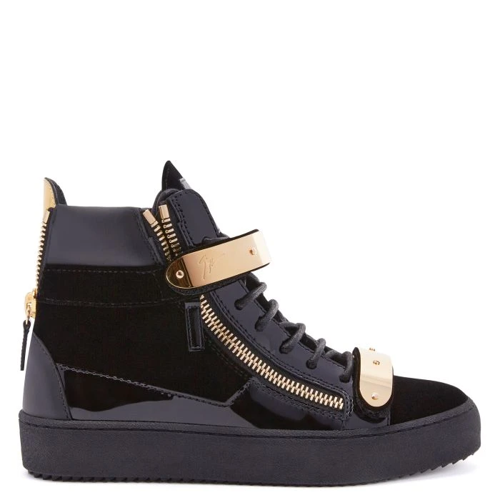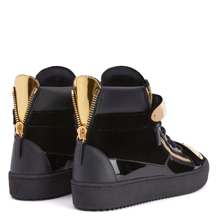 Here, an iconic and utterly unmistakable Zanotti trainer has been recreated with a black velvet upper and black patent inserts. Complete with two golden metal straps, zip fastening at the sides and a black rubber sole.