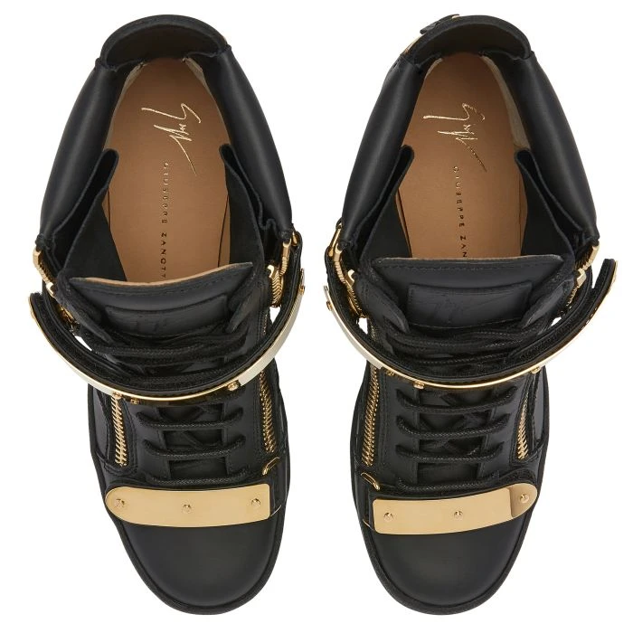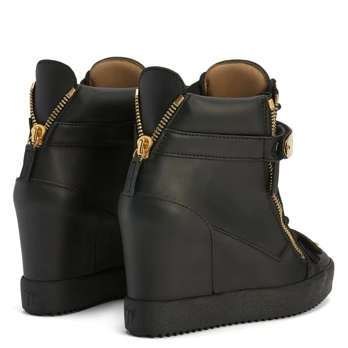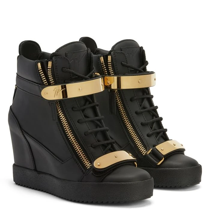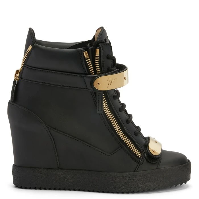 Wedge trainer black with two gold metal straps with logo, zip fastening at the sides and rubber sole with wedge inside.