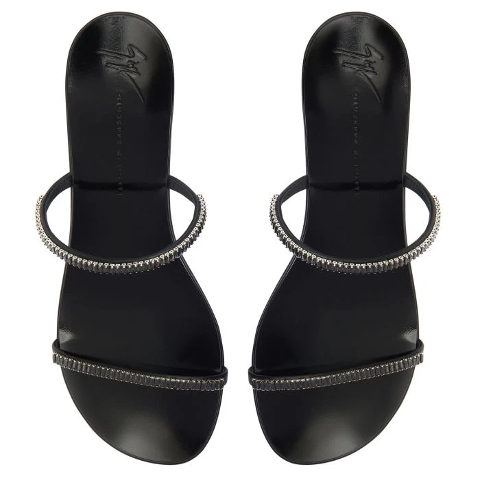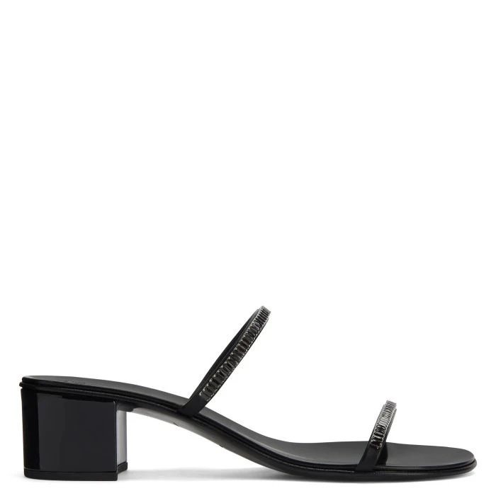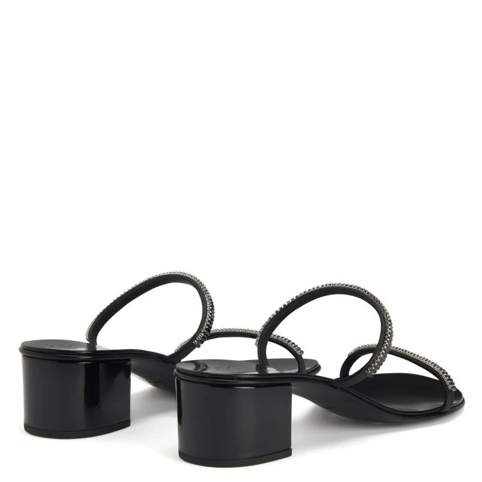 Made from black laminated leather, this sandal features thin straps decorated with silver metal chains and applied black rhinestones and is characterised by a tone-on-tone covered chunky heel.