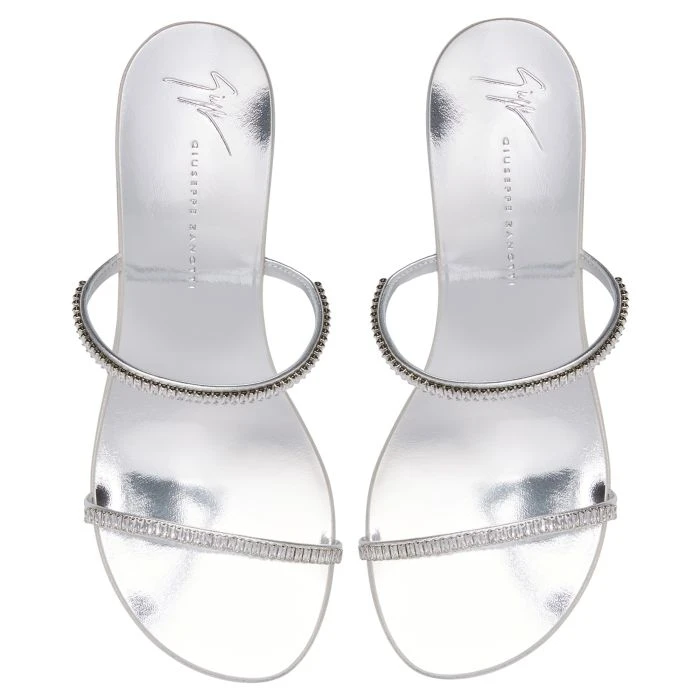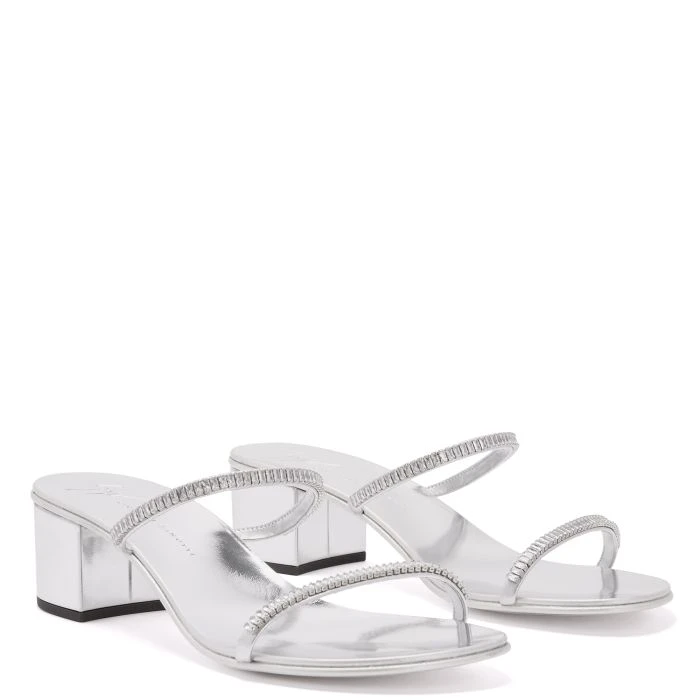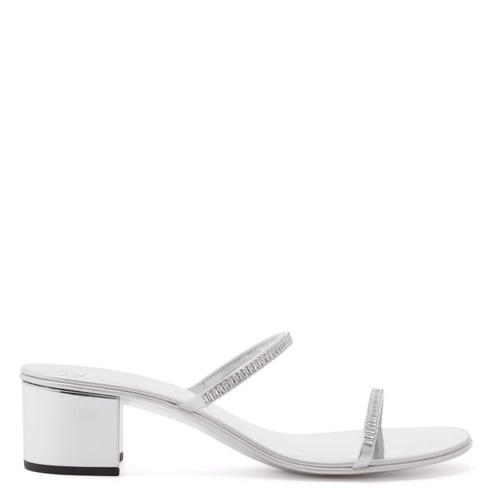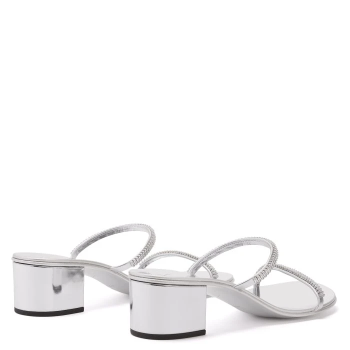 Made from silver laminated leather, this sandal features thin straps decorated with silver metal chains and applied silver rhinestones and is characterised by a tone-on-tone covered chunky heel.