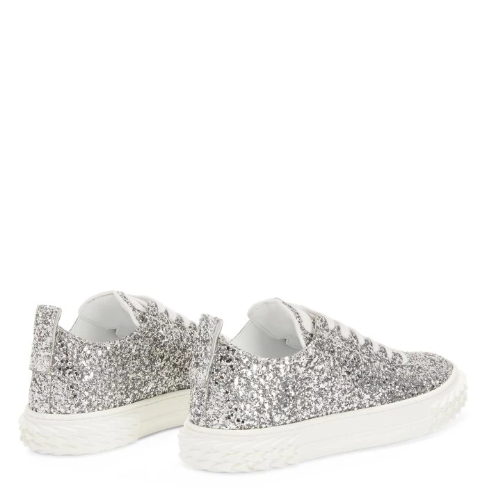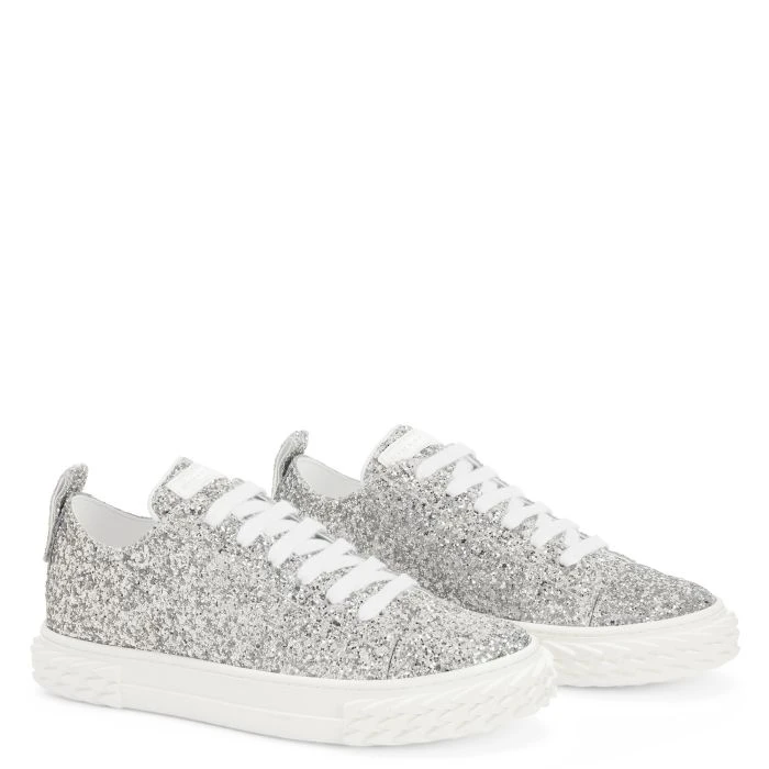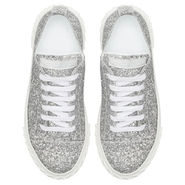 Low-top sneakers crafted from silver synthetic glitter fabric with white cotton laces, featuring a matching ‘Label Signature’ on the tongue; the eye-catching, off-white rubber 3D ‘Blabber’ sole gives the design a perfect finish.