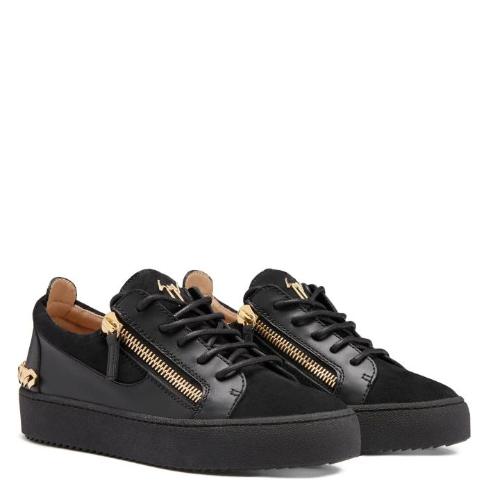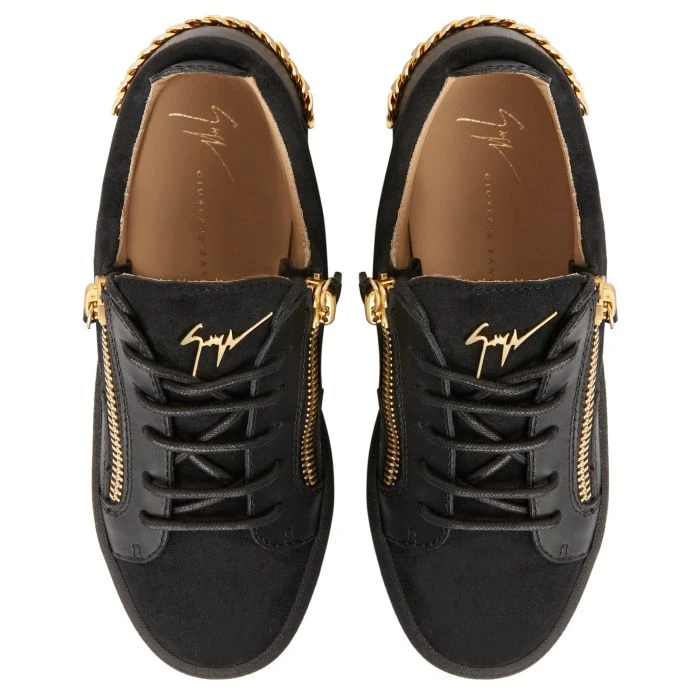 Low-top lace-up trainers in black suede and tone-on-tone leather, embellished with a golden metal link chain on the heel and a golden metal zip at the side. Complete with golden Signature and black rubber sole with logo.