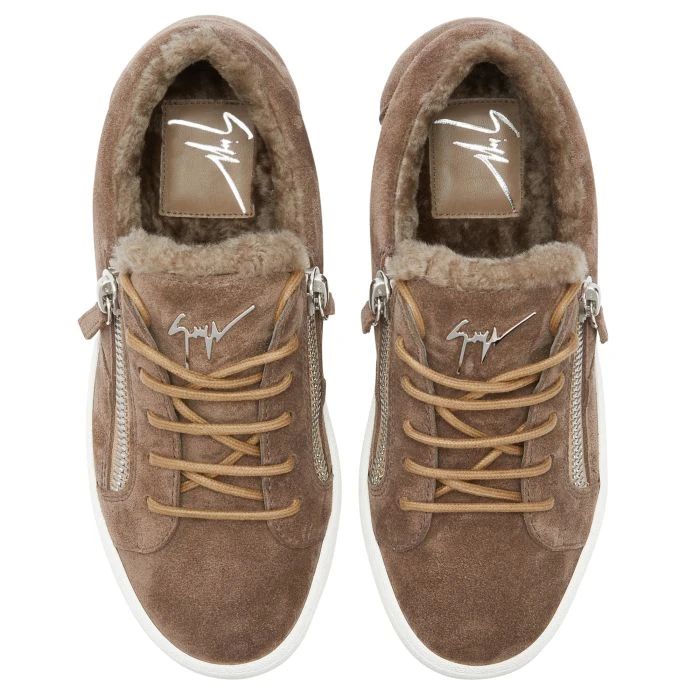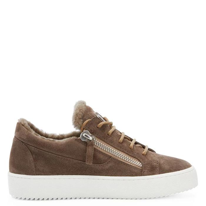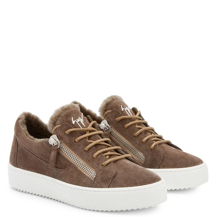 Low-top sneakers, crafted from taupe velour with matching sheepskin inner lining and tone-on-tone cotton laces, featuring a silver metal ‘Signature’ detail on the tongue and silver side zipper fastenings on the upper; a white rubber sole gives the design a perfect finish.