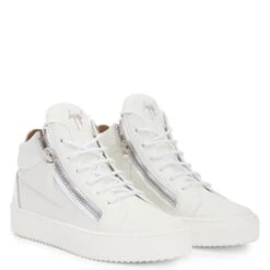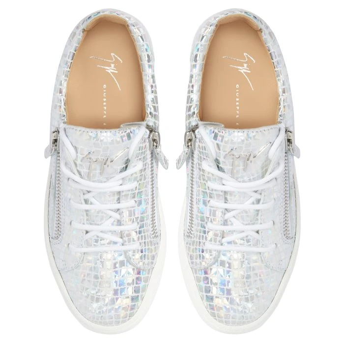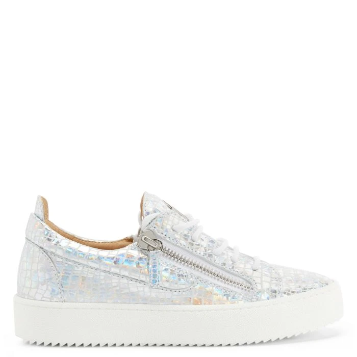 Low-top sneakers crafted from white suede with a iridescent and laminated crocodile print and white cotton laces, featuring a silver metal ‘Signature’ detail on the tongue and silver side zippers fastenings on the upper; a white rubber sole gives the design a perfect finish.