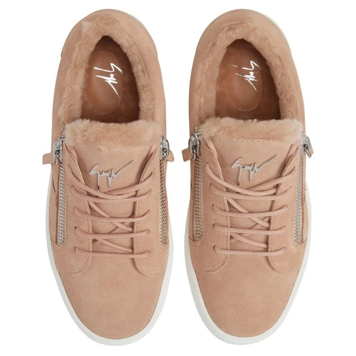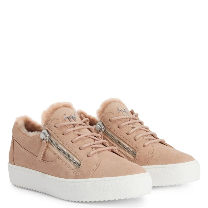 Low-top sneakers, crafted from pink velour with matching sheepskin inner lining and tone-on-tone cotton laces, featuring a silver metal ‘Signature’ detail on the tongue and silver side zipper fastenings on the upper; a white rubber sole gives the design a perfect finish.