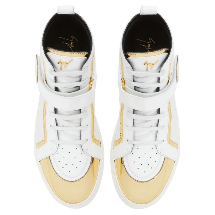 These high-top sneakers are crafted from white leather and synthetic fabric with patent effect, with mirrored golden synthetic fabric details; the model features a strap plate with a golden metal detail and a matching ‘Signature’ detail on the tongue, and is completed with matching cotton laces and a white rubber sole.