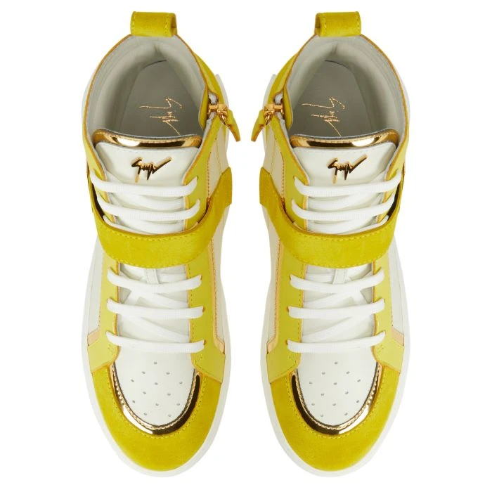 High-top sneakers crafted from off-white and yellow leather, yellow velour and golden mirror-effect synthetic fabric; the design features white cotton laces, a white rubber sole, a strap with a golden metal plaque with logo and a golden metal ‘Signature’ detail on the tongue.