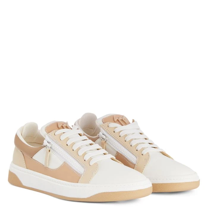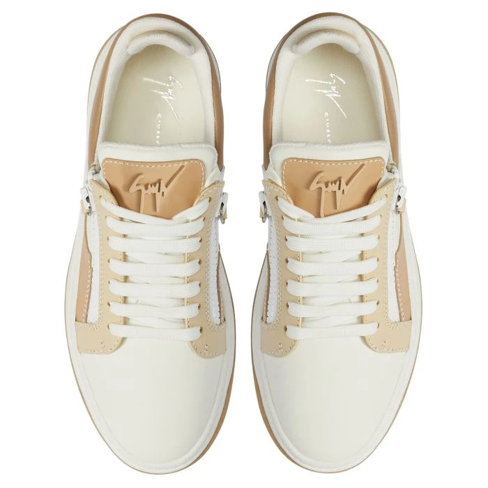 Sneaker crafted from white, brown and beige leather, with white cotton laces and a matching rubber sole with black tread, featuring a beige lacquered metal ‘Signature’ and white plastic side zippers.