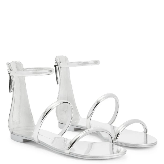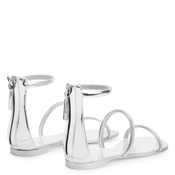Flat sandals crafted from silver synthetic fabric with a mirror effect, featuring matching leather soles, thin straps and back zip fastenings with matching zip pullers.