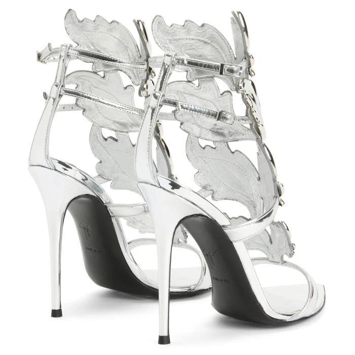 These sandals, crafted from silver mirror-effect synthetic fabric, feature thin adjustable straps with metal buckles and are embellished on the instep with the iconic ‘Cruel’ silver metal detail; matching covered stiletto heels and a leather sole give the design a perfect finish.