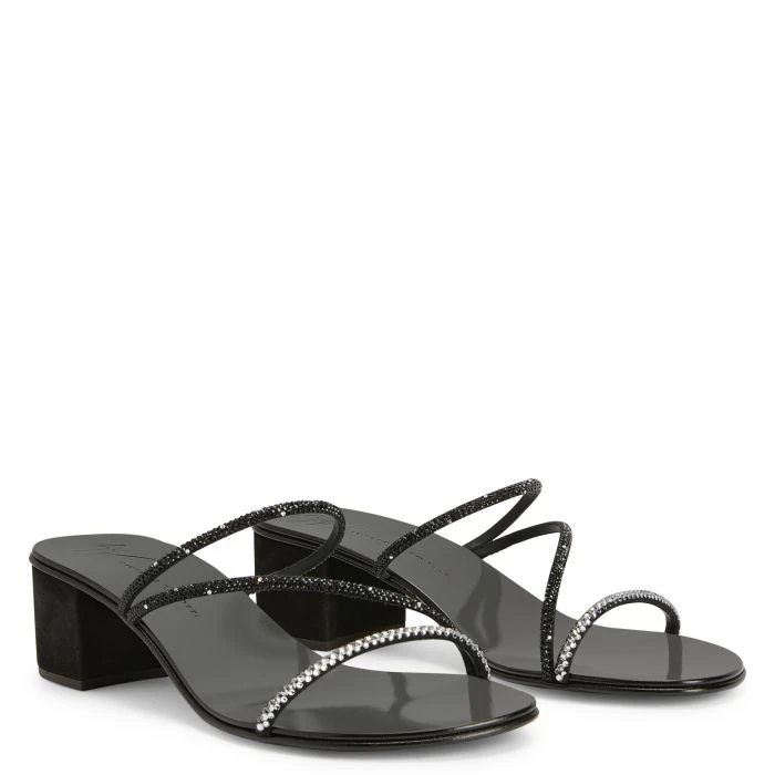 These mules are crafted from black suede and feature thin straps embellished with a black and crystal-coloured rhinestone embroidery, a matching chunky heels and a black leather sole.