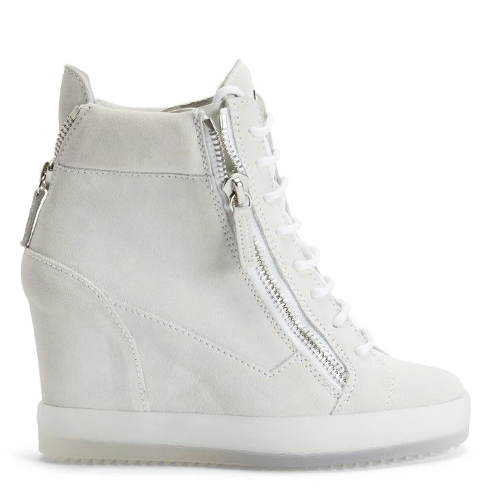These high-top wedge sneakers are crafted from off-white velour with white cotton laces and feature a silver metal side zipper closure and a rubberised metal ‘Signature’ detail on the tongue; a transparent rubber sole with hidden wedge completes this sporty-chic model.