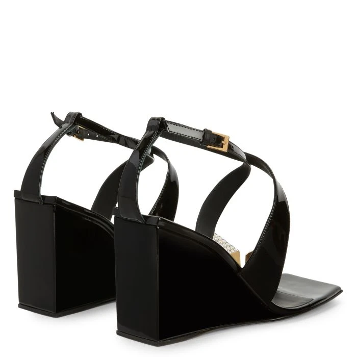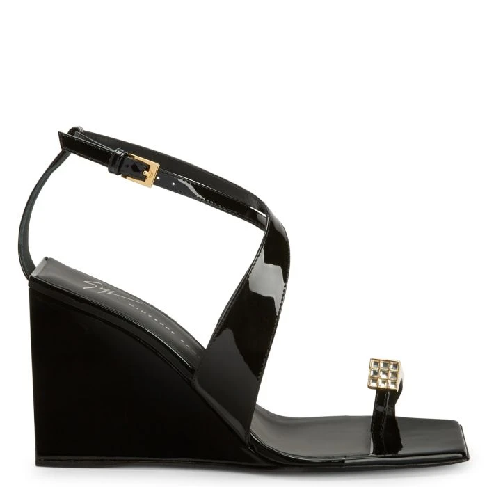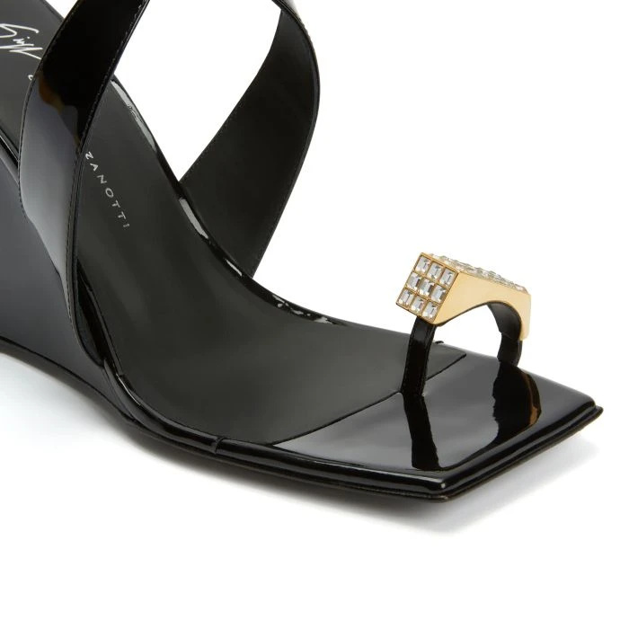 These thong sandals, crafted from black patent leather, feature matching covered wedges and leather soles, a crossed strap that wraps around the instep up to the ankle where there is an adjustable strap with a small golden metal buckle, and are embellished with golden metal hardware with crystal-coloured rhinestones applied to the thong strap.