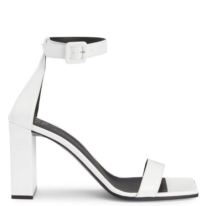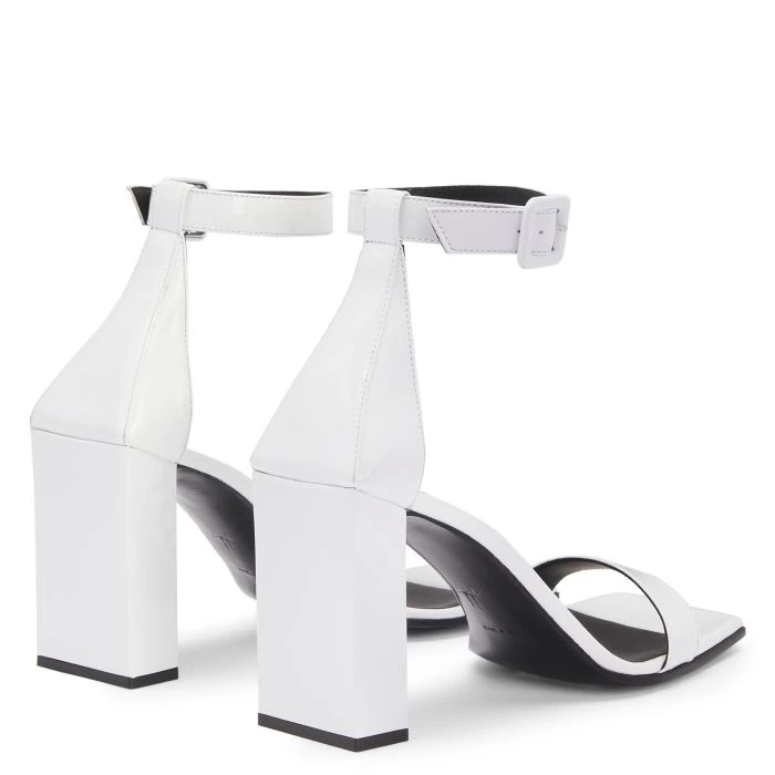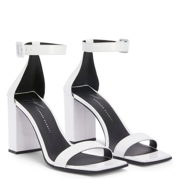 Sandals crafted from white synthetic fabric with a patent leather effect and leather soles, featuring square shapes, adjustable ankle straps with side buckles and matching covered chunky heels.