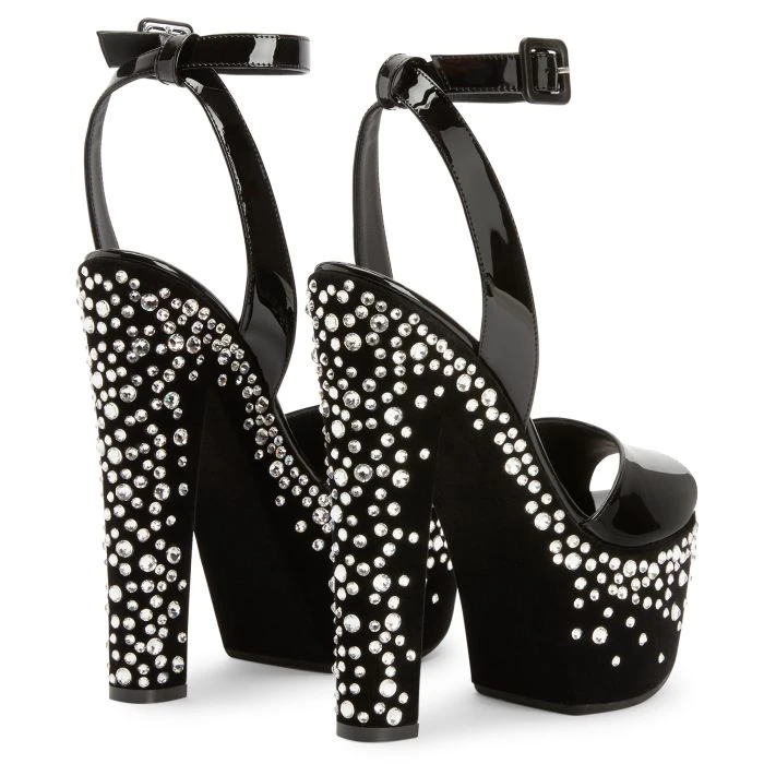 These peep-toe sandals crafted from black patent leather feature a synthetic suede effect fabric covered bottom, an adjustable ankle strap with an upper-matching small buckle and matching chunky platform and heels with crystal-coloured rhinestone embroidery.