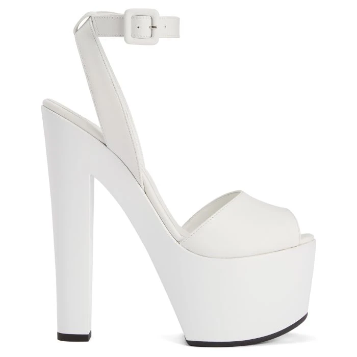 Peep-toe sandal made from white leather, with adjustable ankle strap featuring a small upper-matching buckle and tone-on-tone covered chunky platform and heel.