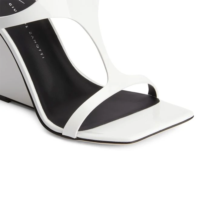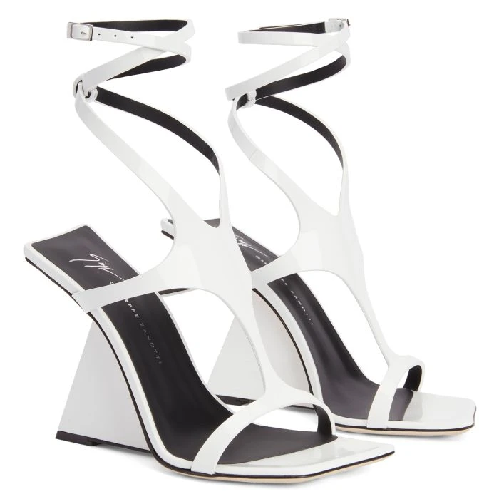 Made from white patent leather, this sandal has an upper that wraps around the foot up to the ankle, where there is a criss-crossing strap adjustable via a small side buckle. Complete with leather sole, this shoe is characterised by its squared edges and peculiar silhouette that gives it an alluring futuristic style.