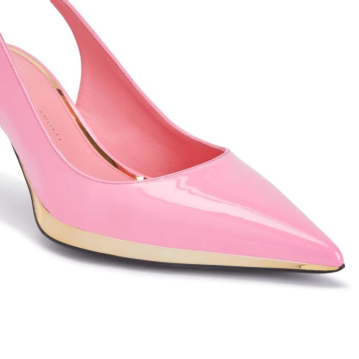 These pointed-toe slingback pumps, crafted from pink patent leather, feature matching covered stiletto heels and are embellished with a black leather sole outlined by a golden mirror-effect detail on the outside.
